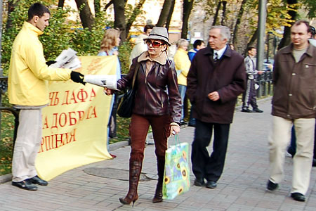 贾庆林到乌克兰访问期间被告群体灭绝图为学员在中使馆前和平抗议并向人们讲真相