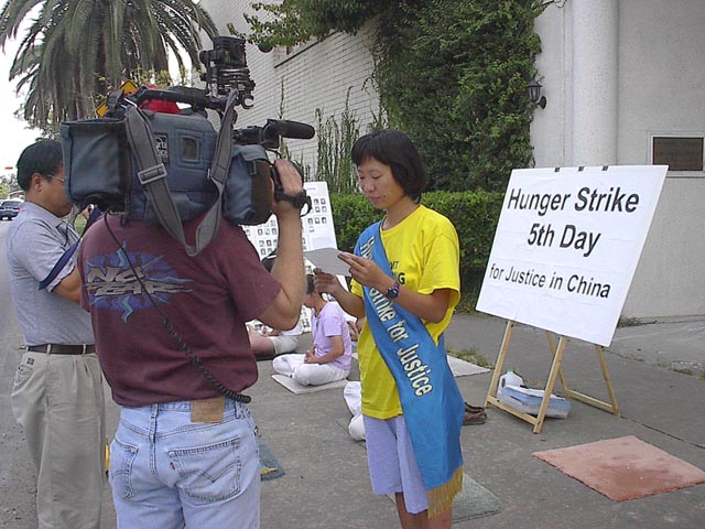 德州法轮功学员周巧愚为声援大陆马三家劳教所绝食的同修及其受牵连的家属而绝食静坐图为绝食第五天接受当地电视台记者采访 美国 2001-8
