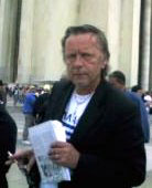 学员在法国巴黎“人权广场”讲真相,图为歌星Renaud先生拿了一摞资料将真相告知他周围的人