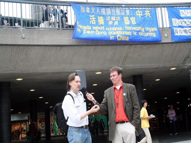 瑞典学员在斯德哥尔摩举办活动向游人和市民揭露中共迫害法轮功的暴行 图为一家当地报刊编辑主动帮忙介绍共产邪恶 2006-7-20