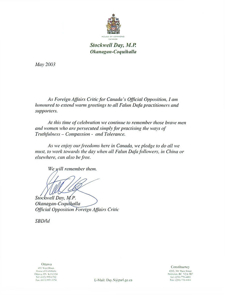 加拿大国会议员致信法轮功学员表示要为所有法轮大法修炼者都能享有自由而努力 加拿大 2003-5