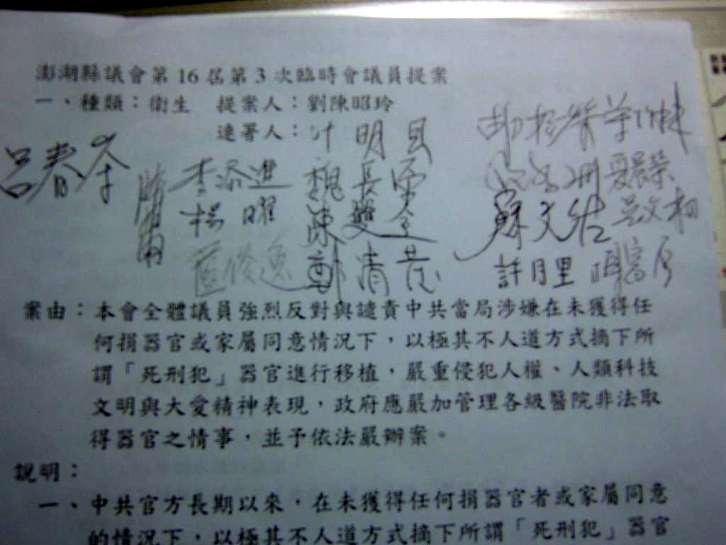 台湾澎湖县议会通过“制止中共活摘器官”议案 图为议案由全体议员联署2006-8-4