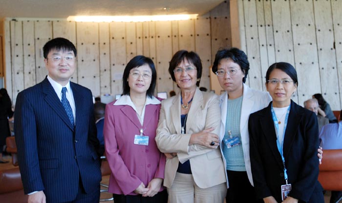 联合国人权专员谴责新加坡政府做中共迫害法轮功的帮凶 图为新加坡法轮功学员与联合国“暴力侵害妇女问题”特派专员(中)的合影