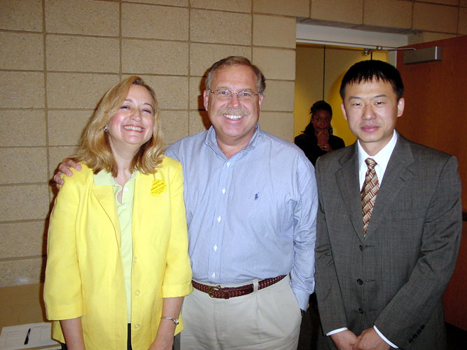 美国斯麦纳市市长麦克斯-贝肯(中)支持法轮功学员的人权,图为与法轮功学员的合影