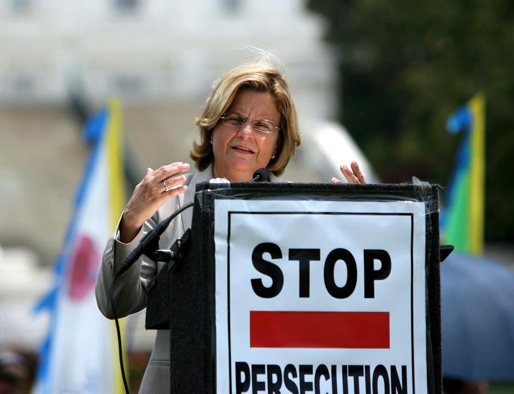 法轮功学员在美国国会山庄前集会呼吁解体中共,结束迫害图为美国会议员雷婷娜发言2007-7-19