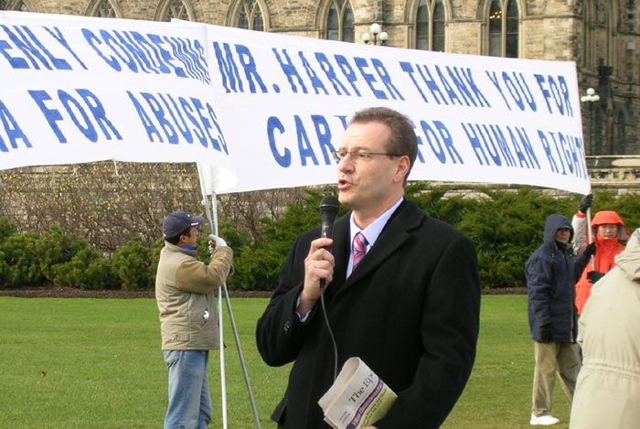 学员和华人团体在国会山支持加拿大总理坚持人权的立场图为国会议员Borys Wrzesnewskyj发言