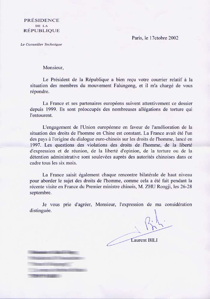 法国总统府复信法轮功协会主席表示对大陆法轮功学员遭受酷刑表示担忧 法国 2002-10-17