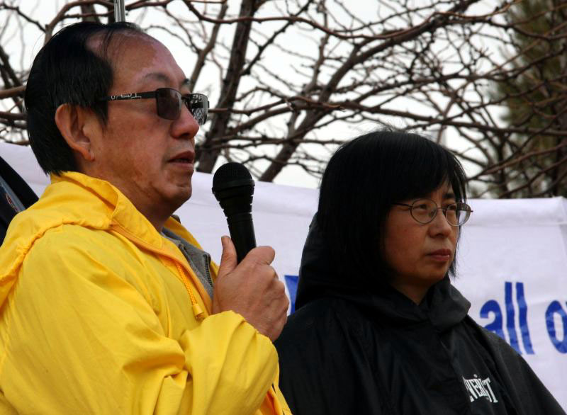 澳中人权对话之际 法轮功学员在澳洲外交部门前举行活动要求停止迫害法轮功 图为中国工党代表发言谴责中共暴行2006-7-24