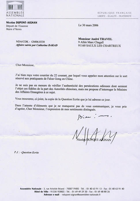 法国议员要求制止对法轮功学员的迫害与屠杀2006-5