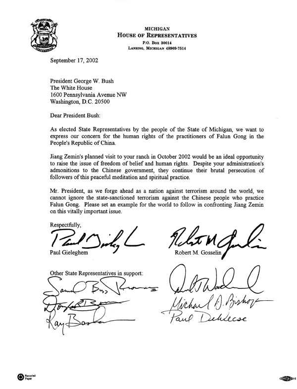 密歇根州议员联名致信布什总统呼吁不能忽视江氏集团对中国法轮功学员施行的国家恐怖主义 美国 2002-9-17