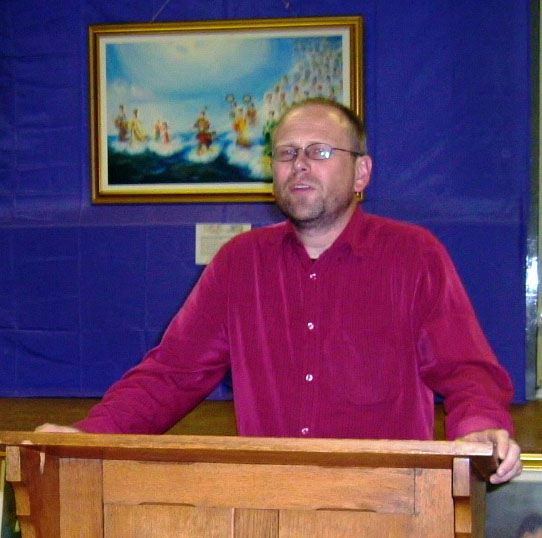 法轮功学员在剑桥大学举办真善忍国际美展图为心理咨询专家保罗•哈比特先生发言2007-8-14