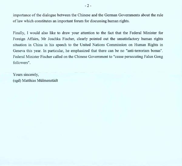 德国总统代表复信法轮功学员表示总统向中国国家主席呼吁在中国尊重人权 德国2002-10-29