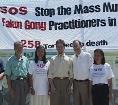 加国议员参加使馆前静坐声援法轮功 图为著名人权律师、教授、国会议员考特勒和国会议员瑞德与法轮功学员合影 加拿大 2001