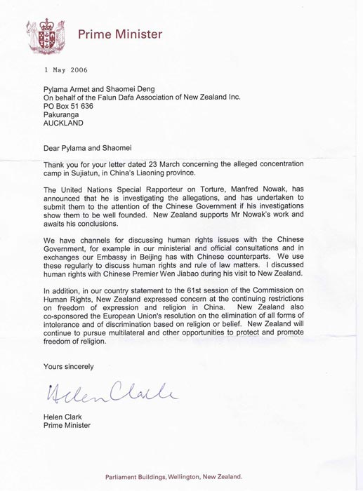 新西兰总理Helen Clark给大法协会的复信中,表示支持联合国专员对中共集中营的调查2006-5-1