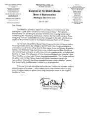 法轮功学员在美国会山庄前集会吁解体中共图为国会议员Frank Pallone的信函2007--7-19