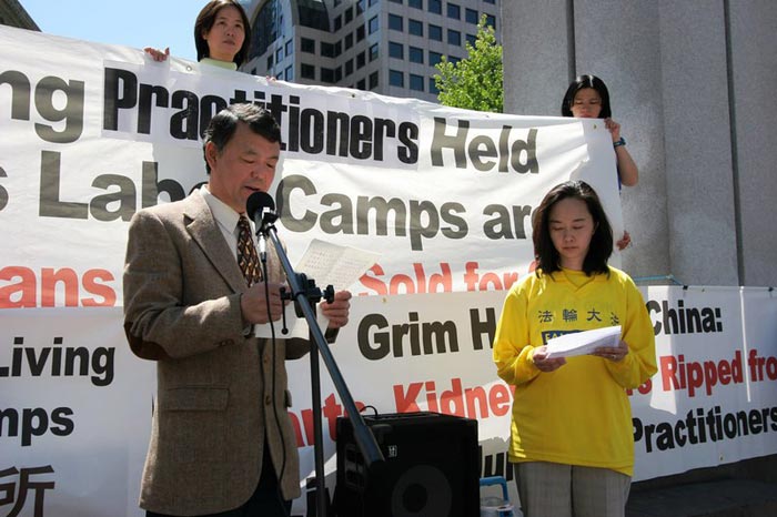 法轮功学员在西雅图Westlake Park参加世界反酷刑日,图为中国民主团结联盟霍明学先生发言