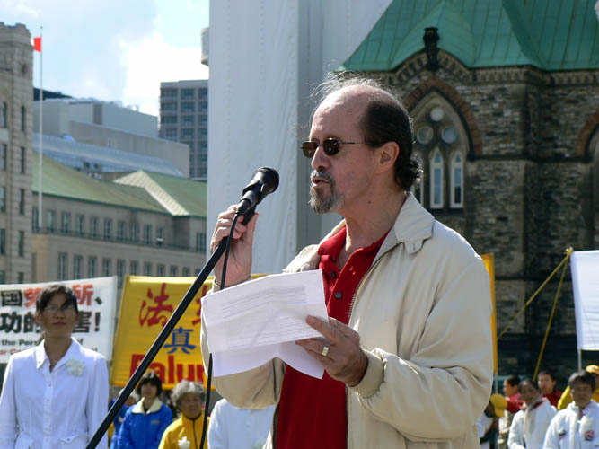 加拿大学员和国会议员在国会楼前集会吁制止中共活摘器官的罪行,图为外交官布赖恩•麦克亚当发言