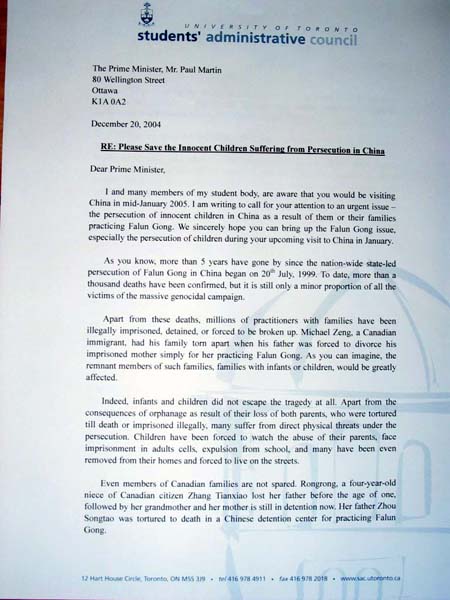 多伦多大学学生会呼吁加总理帮助营救在中国受迫害的法轮功学员的孩子们