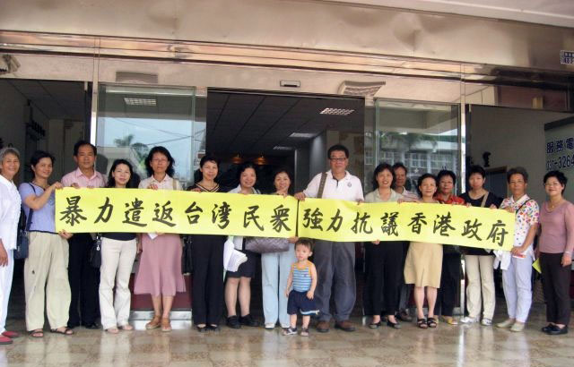 台湾苗栗县议员谴责港府非法遣返事件图为苗栗县赖议员(中穿白色上衣)和学员和照.2007-7-10