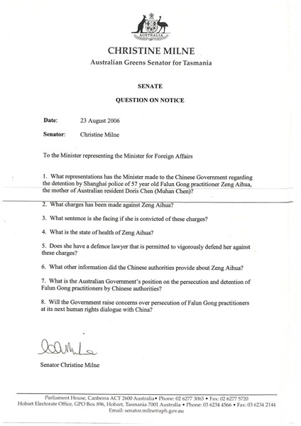 澳洲参议员就曾爱华被中共非法关押质询外交部长为图为米尔恩参议员书面质询的文件