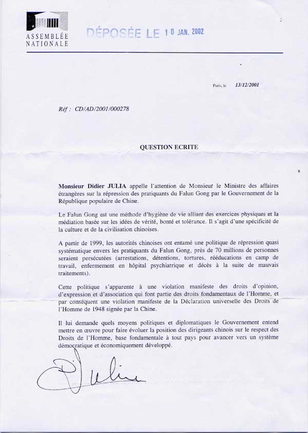 法国议员书面质询:迫害法轮功是对基本人权的明显侵犯 法国 2001-12-13