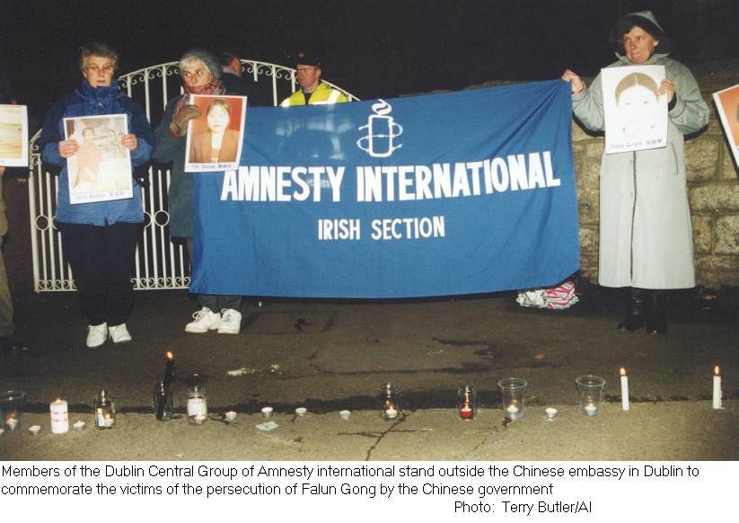 国际特赦组织都柏林中心成员和支持者们在中国使馆外烛光守夜 悼念在中国被迫害致死的法轮功学员 德国 2001-3-1