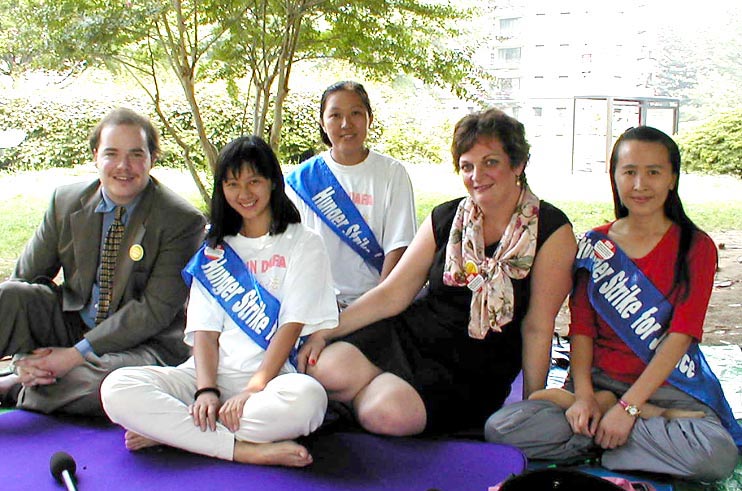 一位白人妇女利用午餐时间与法轮功学员共同静坐,和平请愿要求停止迫害法轮功 美国 2001-8-29