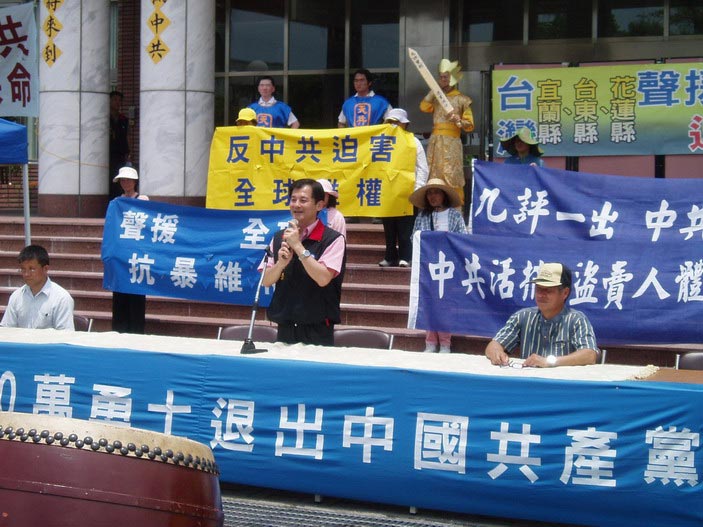 台湾东部民众在花莲县议会广场举行新闻发布会声援二千二百万退出中共图为前国大代表王廷升教授发言.2007-6-3