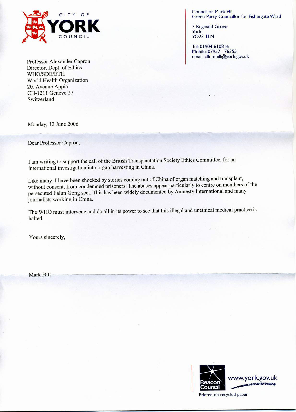 英国议员Mark Hill吁世卫组织制止中共摘取器官暴行图为6月12日致世界卫生组织的信