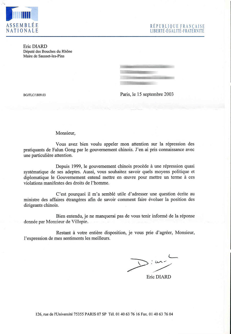 法国议员致信法国外交部长希望结束江氏集团对法轮功学员的迫害 法国 2003-9-15
