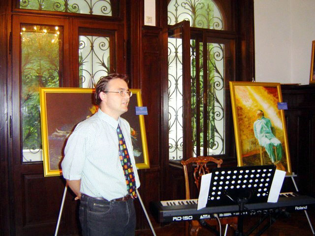 真善忍美展在Payerbach的昆堡艺术展厅拉开帷幕,图为国际人权组织的代表Mag. Leopold致开幕辞