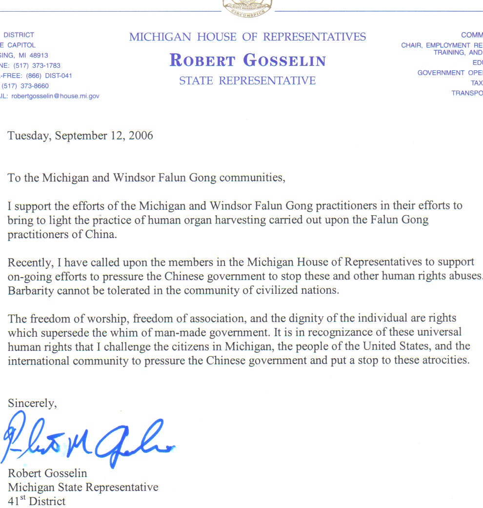 美密西根州众议员呼吁国际社会谴责中共活摘法轮功学员器官的暴行 2006-9-12