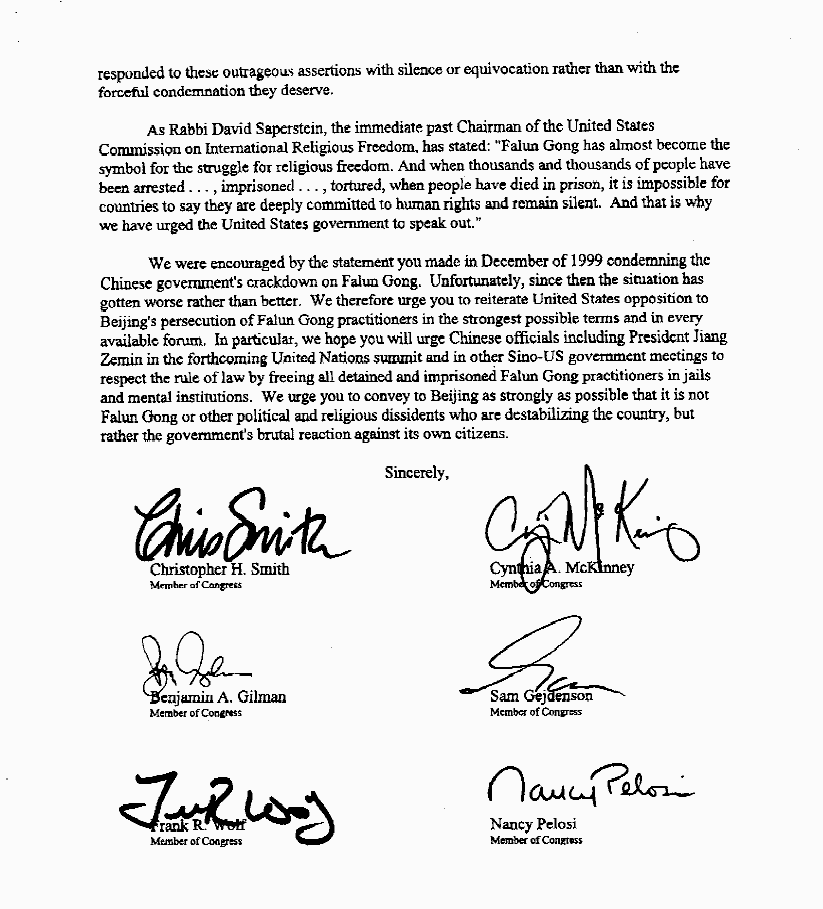 80余名美国众议员就中国迫害法轮功问题联名致信克林顿总统 美国