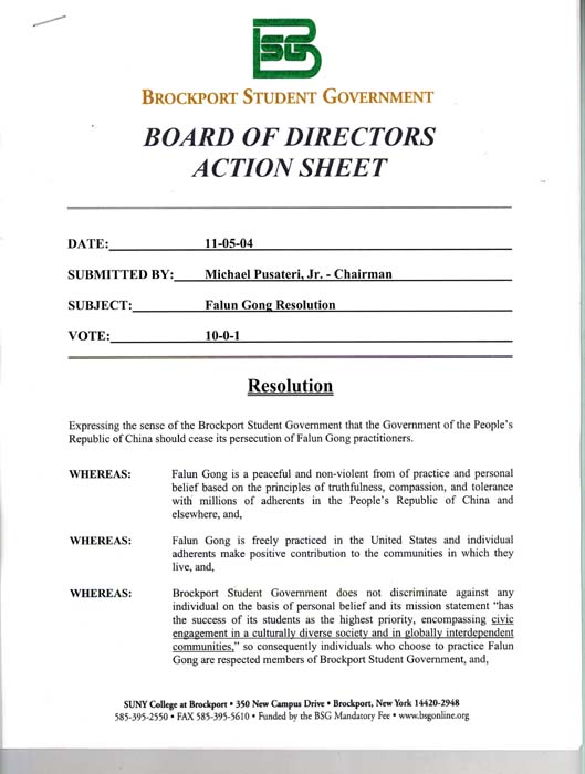 纽约布鲁克波特学院学生管理机构全体成员通过支持法轮功决议 美国 2004-11-5