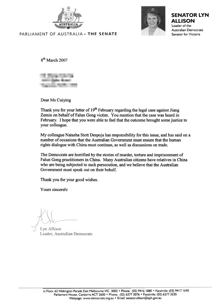 澳洲民主党领袖表示支持法轮功起诉江泽民图为艾丽森女士前后倆次给学员的信件