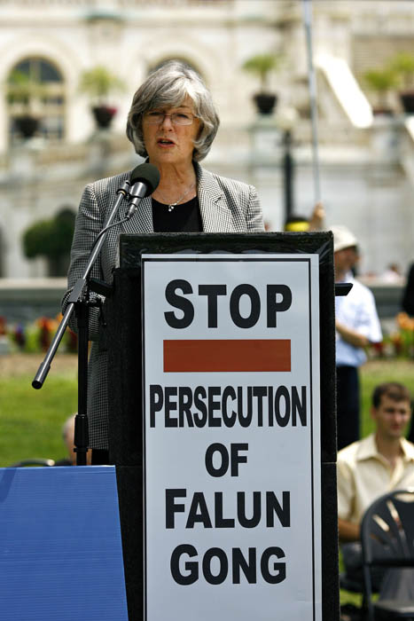 法功学员与各界人士在华府集会吁制止中共迫害,图为伍尔西议员在集会上发言2006-7-20