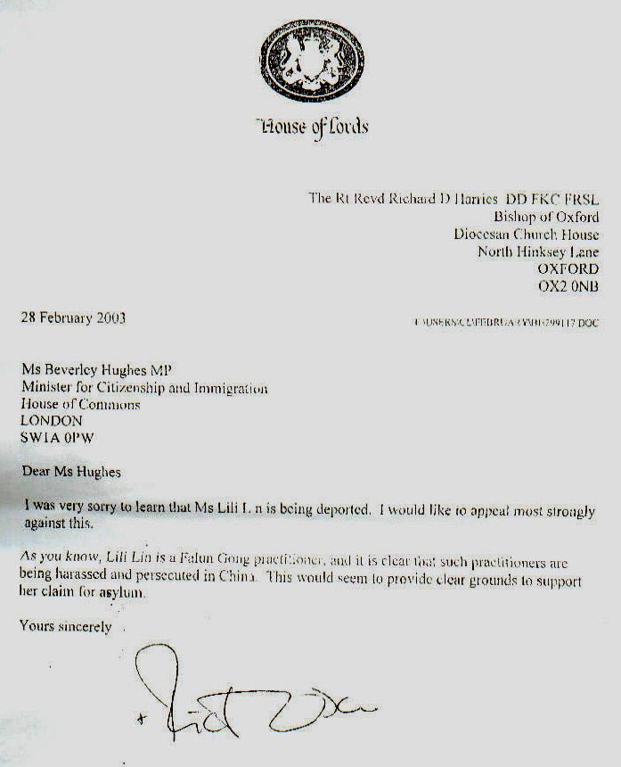 英国牛津大主教致信英国移民官休斯议员要求救援法轮功学员林丽丽 英国 2003-2-18