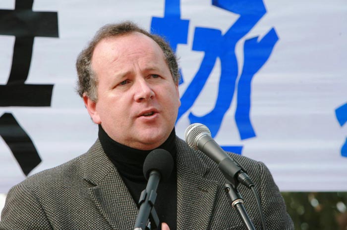 学员及各界人士在墨尔本集会谴责中共活摘器官暴行,图为维多利亚省议员Victor Perton先生发言