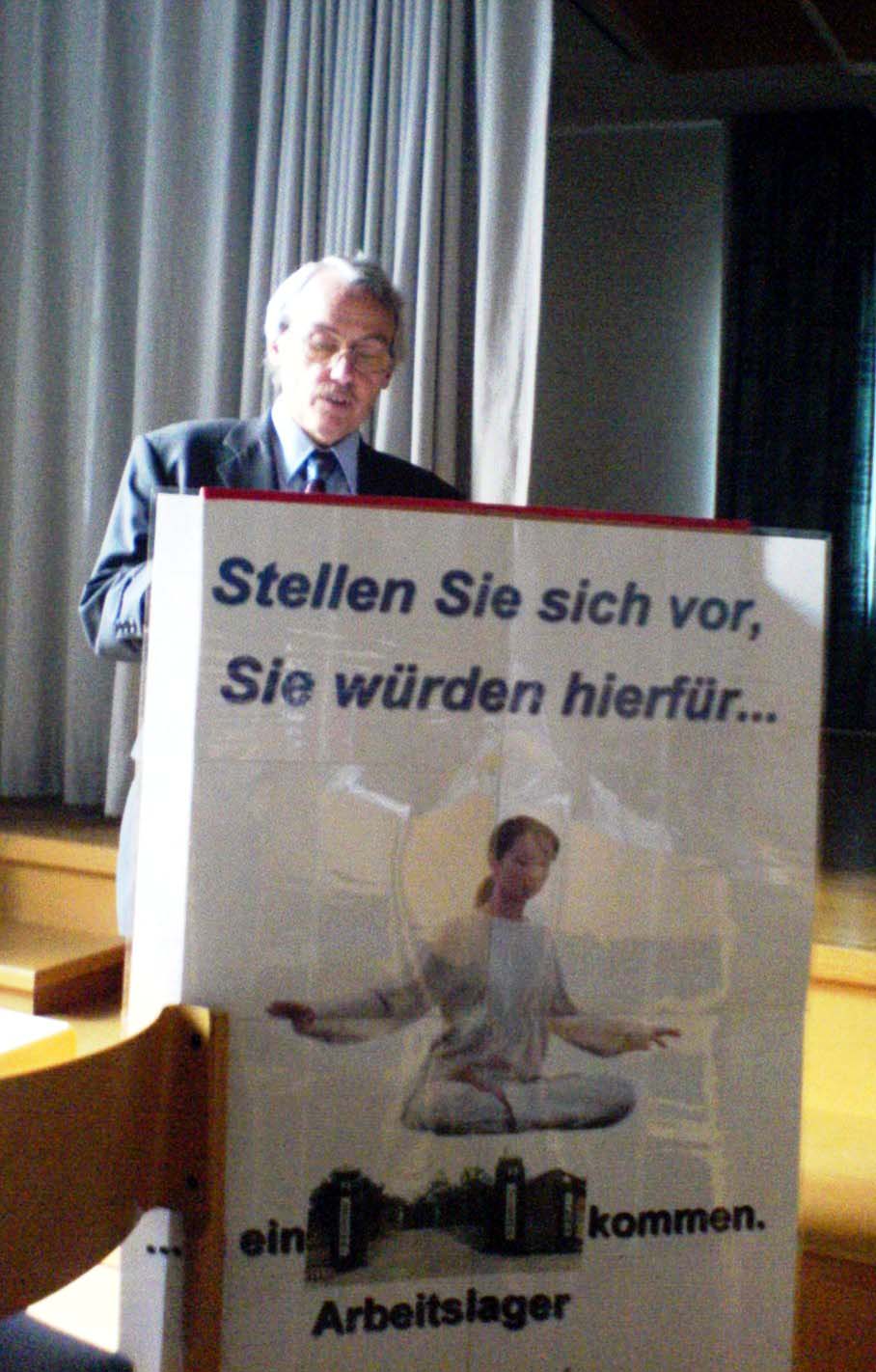 法轮功学员在卡姆市Josef天主教会提供的大厅放映中共迫害的电影图为Kiehl教授致辞