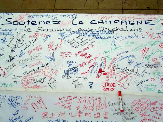 法国法轮功学员在埃菲尔塔前洪扬大法 人权广场上呼吁营救法轮功学员的遗孤 图为满载正义签名支持的白布