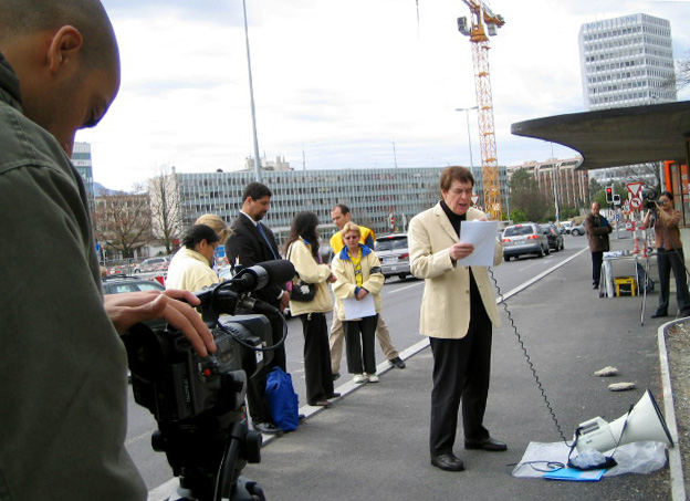 瑞士学员在日内瓦联合国前集会谴责集中营,图为:议员Christian Zangg发言06-3-27