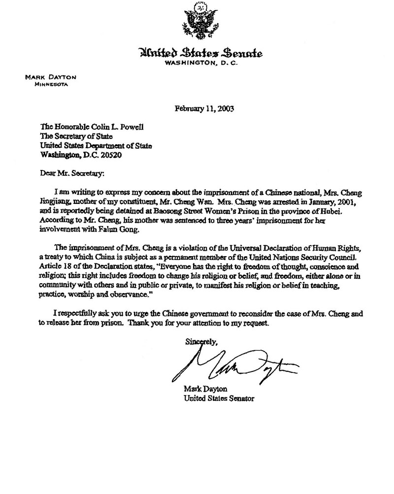 美参议员致信国务卿请求帮助营救在中国被非法关押的法轮功学员 美国 2003-2-11