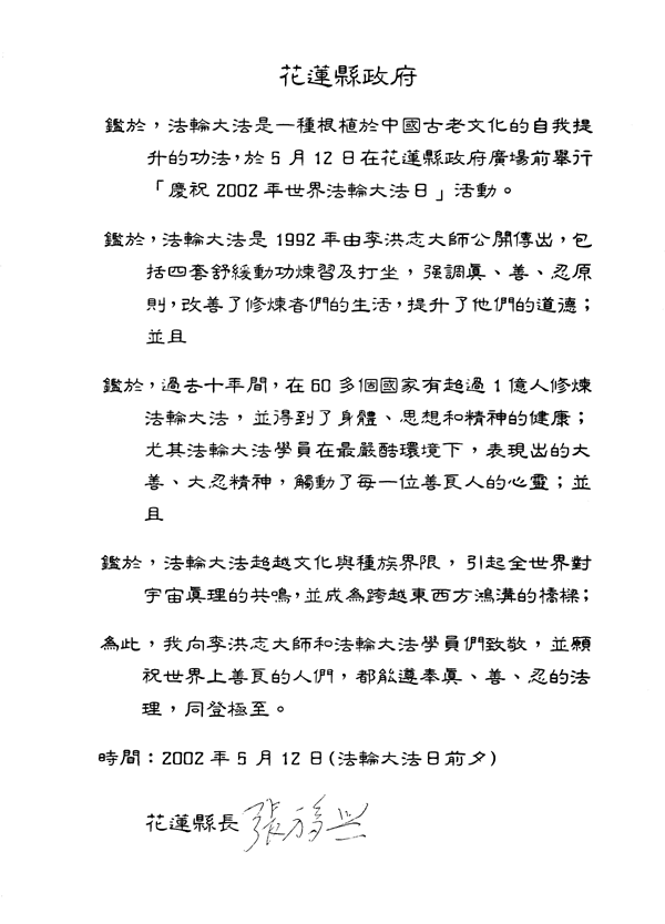 台湾花莲县县长致信祝贺“世界法轮大法日” 台湾 2002-5-12