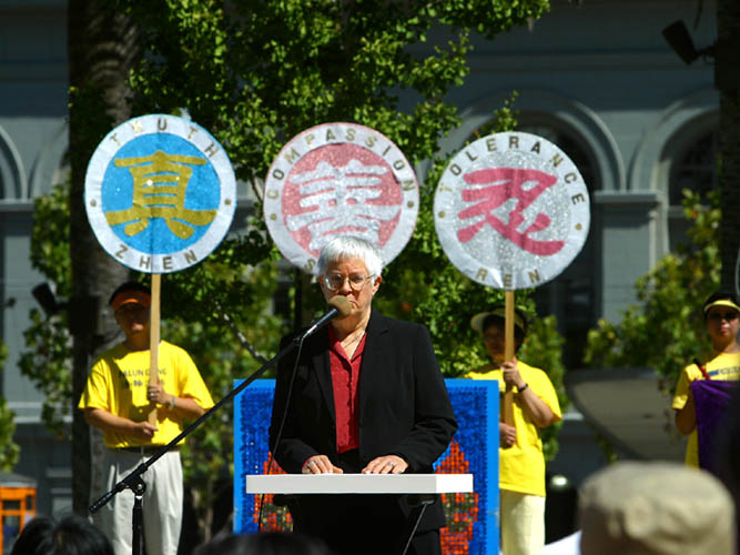 法轮功学员在旧金山集会要求中国政府停止迫害 加州议员汤姆-兰托斯的代表玛格丽-法莱发言表示支持 美国 2003-9