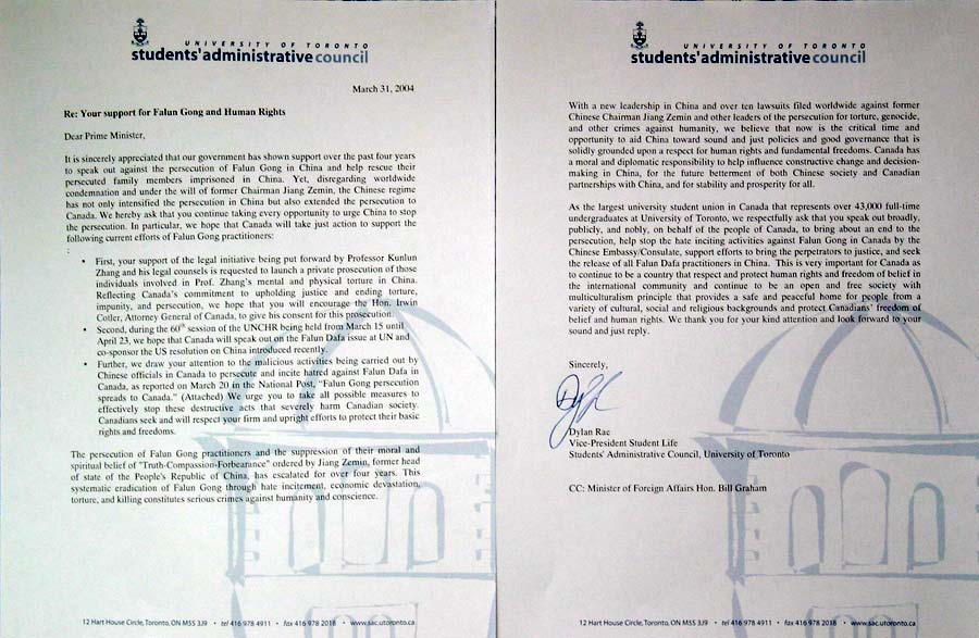 多伦多大学学生会致信加国总理 呼吁制止迫害法轮功支持审判迫害法轮功的元凶江XX 加拿大 2004-3-31