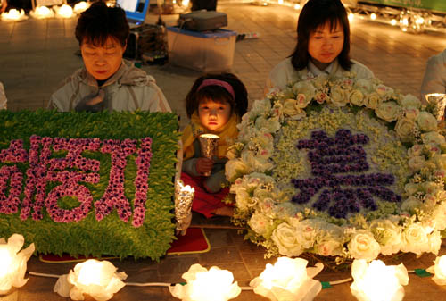 韩国首尔学员和一些市民团体在韩国主要媒体聚集的 “东亚日报”大厦前烛光悼念被迫害致死的同修,抗议中共盗卖学员器官兽行,呼吁制止迫害 2006-4-21