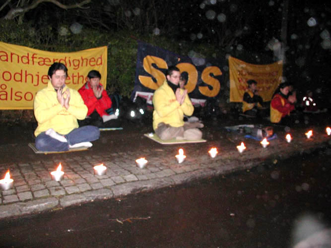 丹麦法轮功学员国际人权日在中国大使馆前烛光守夜 要求中国政府尊重人权,停止迫害法轮功 丹麦 2001-12-10