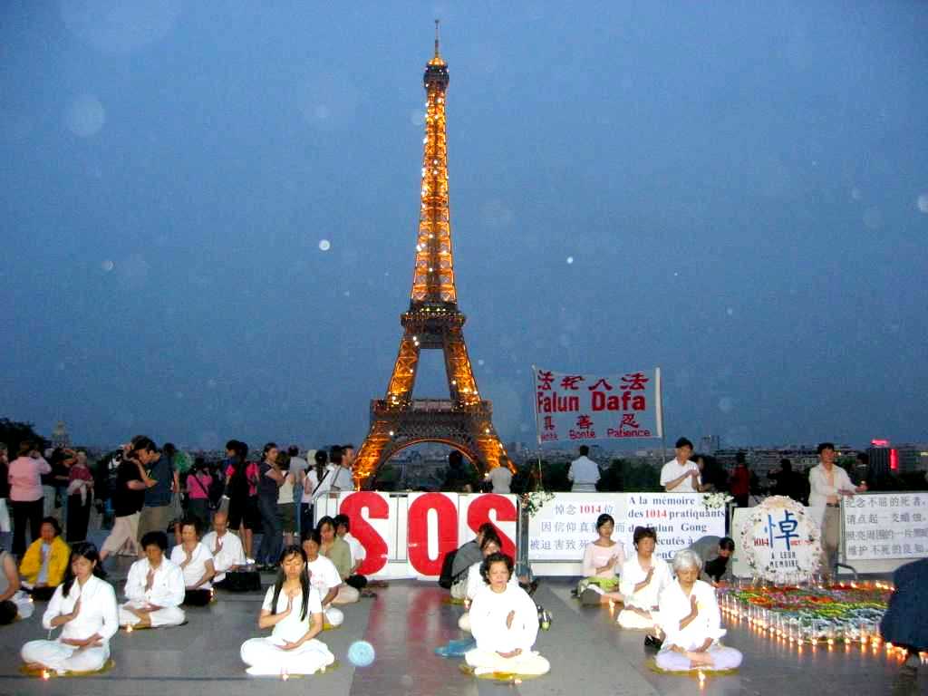 法国法轮功学员在巴黎埃菲尔铁塔对面的人权广场与全球法轮功学员同步举行“点一支蜡烛”活动,悼念在中国被迫害致死的同修 法国 2004-7-23