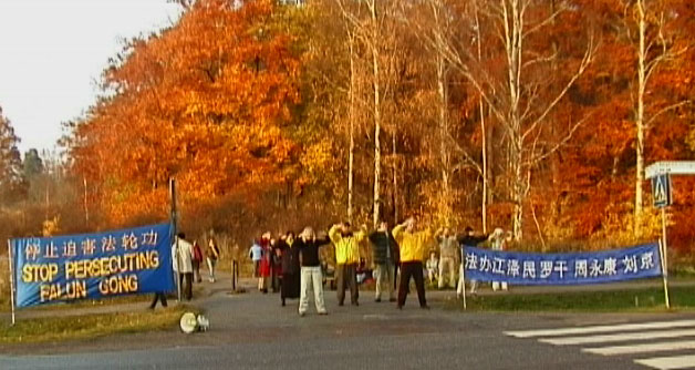 瑞典学员中使馆前宣读法轮大法学会公告─2005年11月4日