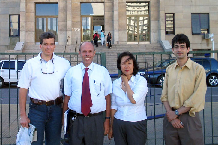 中共恶人罗干访阿根廷期间,学员以群体灭绝罪和酷刑罪起诉之。图为律师(左二)与学员合影 2005-12-13